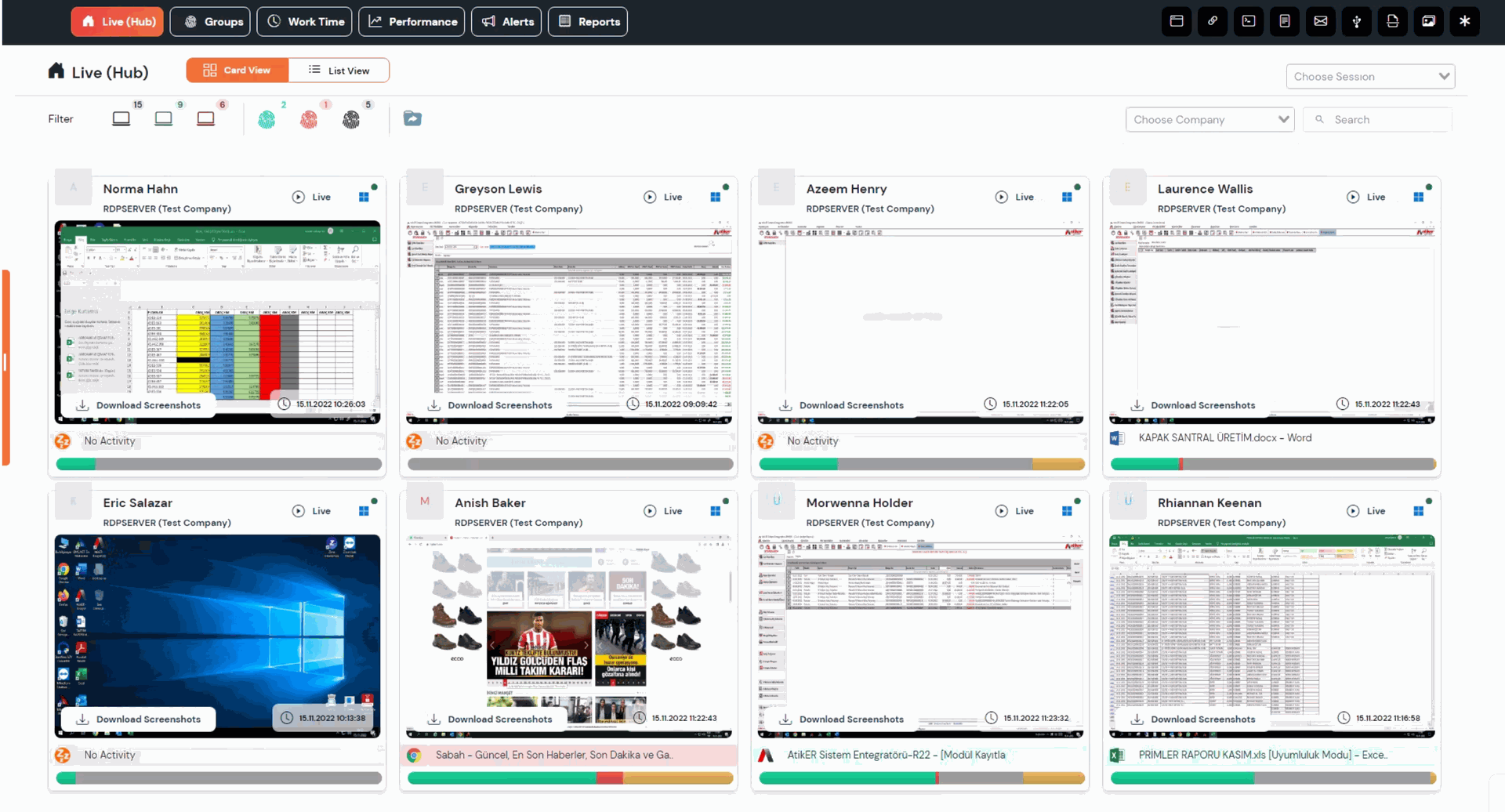 Perwatch ile yöneticiler, çalışanların mesai içindeki tüm aktivitelerini şeffaf şekilde görebilir. Hangi uygulamalarda, hangi web sitelerinde ne kadar süre geçirdiği, toplantılara katılımı ve aktif iş üretkenliği raporlarla anlık olarak izlenir.